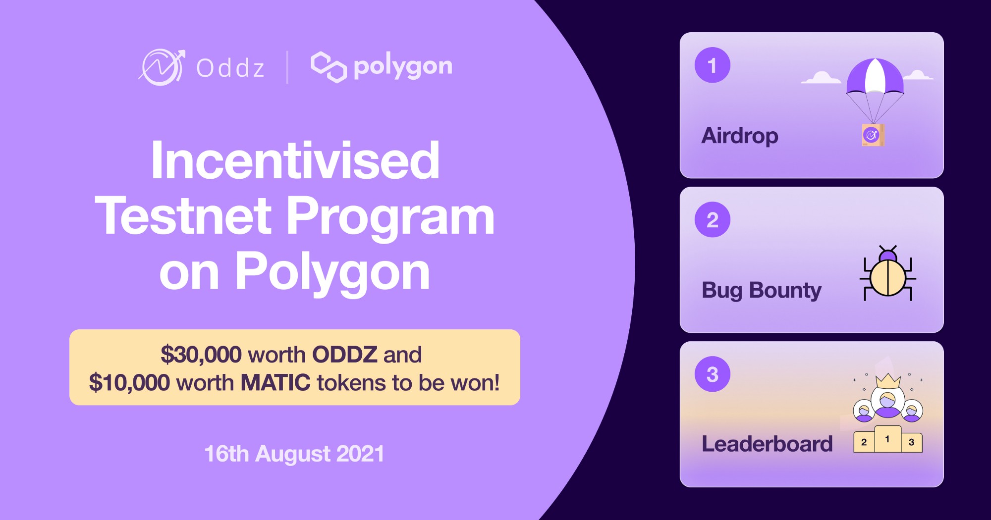 폴리곤 네트워크에서의 인센티브형 테스트넷 프로그램은 세 가지의 주요 이벤트로 구성됩니다 - 리더보드 챌린지, 버그 바운티 프로그램, 에어드롭! 총 상금 $30,000 ODDZ 토큰과 $10,000 MATIC 토큰이 각각 배분되었습니다.