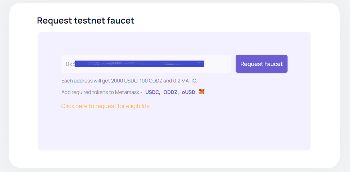 스텝 6: 이제 Peggy 토큰을 클릭한 후 테스트넷 프로그램에 지원할 때 사용한 Matic 테스트넷 지갑 어드레스를 입력합니다. 이것으로 당신은 지갑에 2000 테스트 USDC, 100 ODDZ 그리고 0.2 MATIC 토큰을 받게 됩니다. 매주 포셋을 청구하는 트레이더는 기존 청구에서 추가적으로 500 USDC를 받게 되어 Oddz의 다양한 기능들을 더욱 탐방할 수 있게 됩니다.