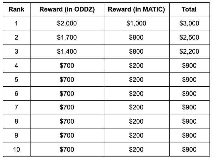 - 총 에어드롭 - 총 $16,000 상당의 ODDZ 및 MATIC 토큰이 리더보드 11위에서 210위 사이의 에어드롭 적격 참가자에게 에어드롭됩니다.
