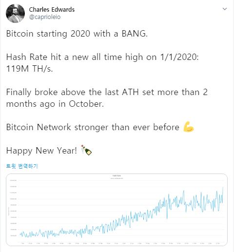 첫번째는 비트코인의 해쉬레이트입니다. 비트코인 해쉬레이트는 1월1일에 최고점을 갱신한후, 계속해서 상승하고 있습니다.