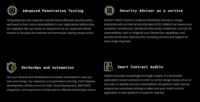 보안 작업에는 끝이 없습니다. Halborn은 스마트 컨트랙트를 훨씬 뛰어넘어 조직의 가장 중요한 자산을 꾸준히 평가하고 최대의 가치를 창출하며 매 단계마다 세계적인 사이버 보안 컨설팅과 실행을 제공하는 제 3자 파트너 역할을 수행합니다.
