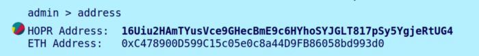 두 개의 어드레스가 나타납니다: 노드의 HOPR 어드레스의 마지막 다섯 글자와 폴리곤 어드레스 (화면상에는 ‘ETH 어드레스’라고 표시됩니다). 전체 HOPR 어드레스를 확인하려면 축약된 버전을 클릭해 확장합니다.