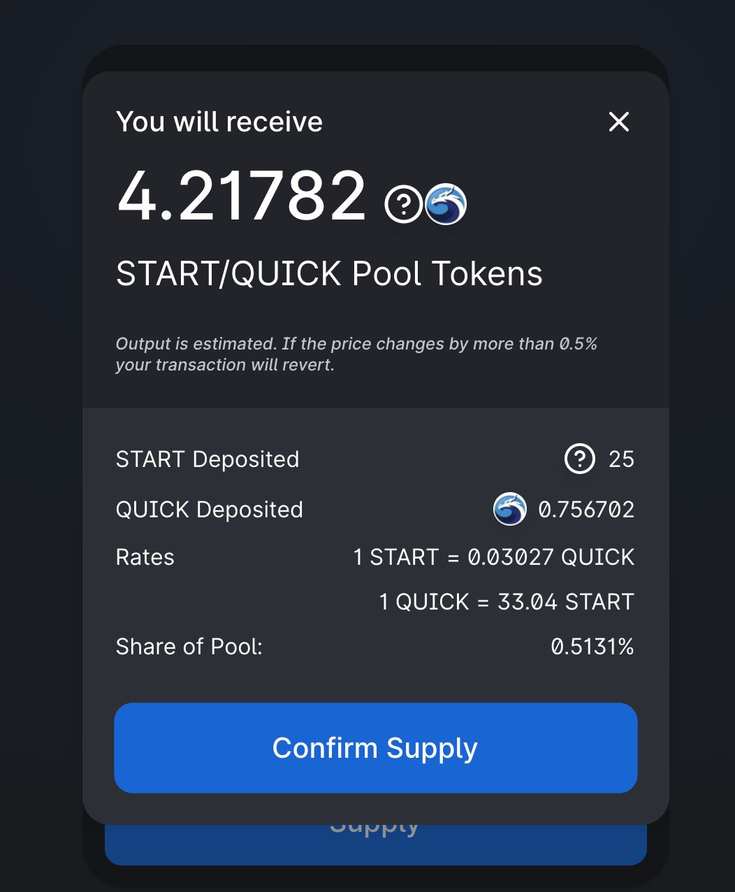 ‘Confirm Supply’를 클릭해 START와 QUICK 토큰을 추가하고 QUICK/START LP 토큰을 받습니다.