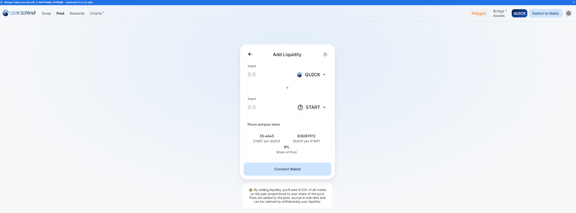 QUICK/START LP 토큰을 구입하기 위해서(그리고 Starter.XYZ 플랫폼IDO 참가 자격 획득을 위해), 당신은 우선 Quickswap.Exchange의 QUICK/START 풀에 유동성을 공급해야 합니다.