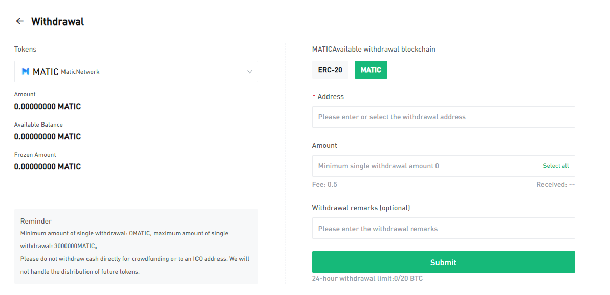 구매를 완료하면 이를 MATIC 메인넷의 온라인 지갑에 ‘Withdraw’ 기능을 통해 직접 전송할 수 있습니다.