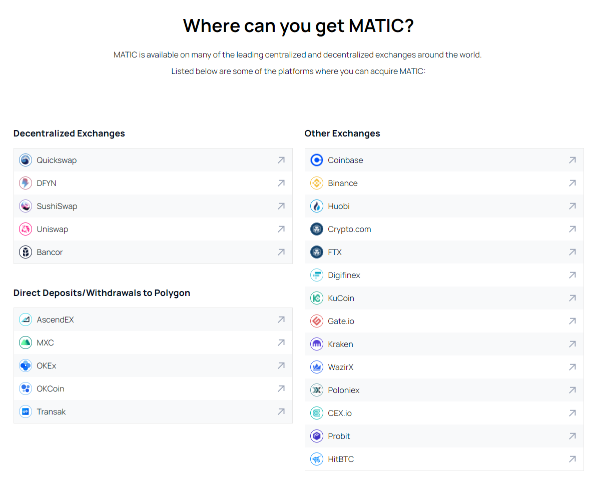 주의: 위 거래소 중 일부는 아직 폴리곤 네트워크를 지원하지 않고 이더리움 네트워크 기반 MATIC만 판매할 수 있습니다 - 이더리움에 MATIC을 갖고 있는 경우 폴리곤 브리지를 통해 폴리곤에 배치해야 합니다.