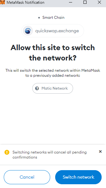 폴리곤에서 Starter 웹사이트 또는 QuickSwap 거래소를 사용할 때 항상 MetaMask가 MATIC 네트워크에 연결되어 있는지 반드시 확인해야 합니다. 다른 네트워크에 연결된 경우, 웹사이트가 네트워크를 변경할 것을 요청하거나, 직접 변경해주는 옵션을 제안할 것입니다.
