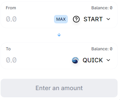 현재 폴리곤에서 $START 토큰을 구입할 수 있는 곳은 QuickSwap.Exchange 뿐입니다. 구입 페어는 QUICK/START로, START 구입을 위해 QUICK 토큰을 사용해야 한다는 뜻이며 START를 판매하면 QUICK 토큰을 받게 됩니다.