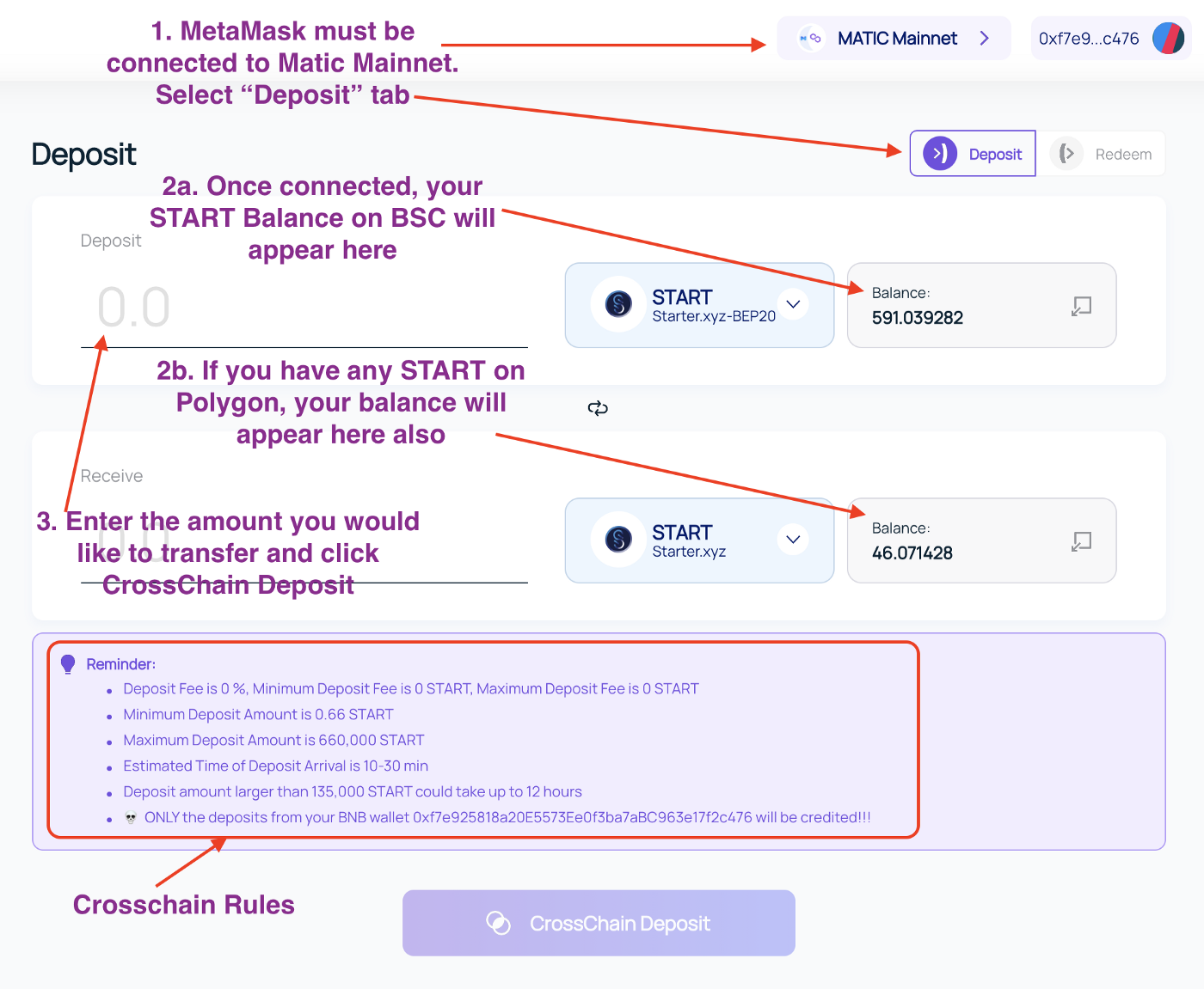 Starter 여러분이 가장 먼저 사용한 가장 쉬운 방법은 START 브리지를 통해 바이낸스 스마트 체인에서 폴리곤으로 START 토큰을 전송하는 것입니다.
