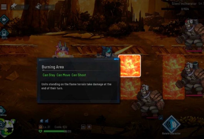 캐릭터에게 영향을 주는 다양한 지형 효과가 있습니다. 어떤 지형은 히어로 스탯을 부스트하고, 또 어떤 지형은 데미지를 입히거나 부정적 효과를 캐릭터에 가합니다.