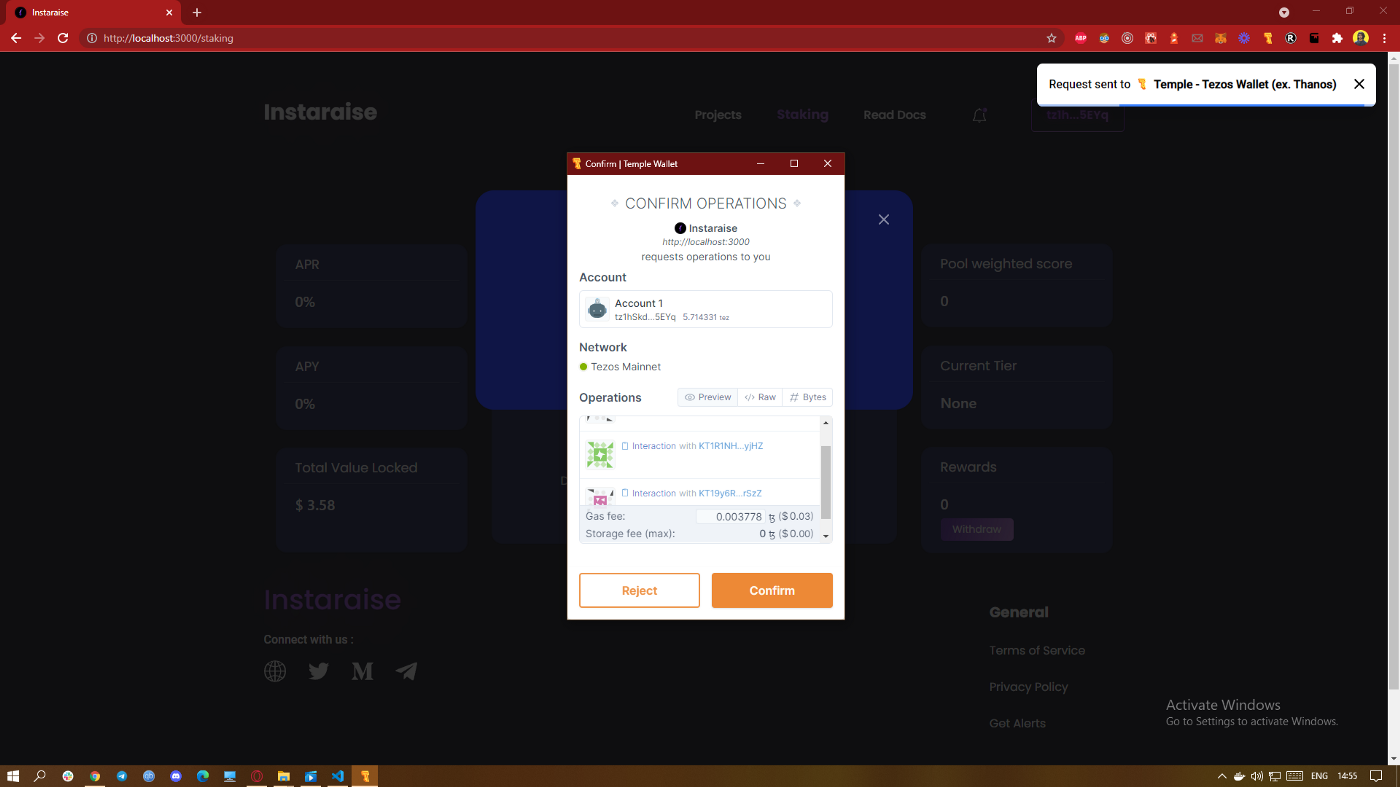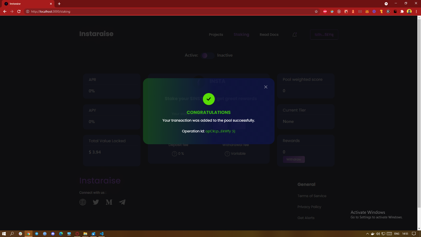 스텝 11: 프로세싱 이후, ‘당신의 트랜잭션이 성공적으로 풀에 추가되었습니다’라는 메시지가 나타납니다. 이것으로 당신은 새 풀에 $INSTA 스테이킹을 시작한 것입니다.