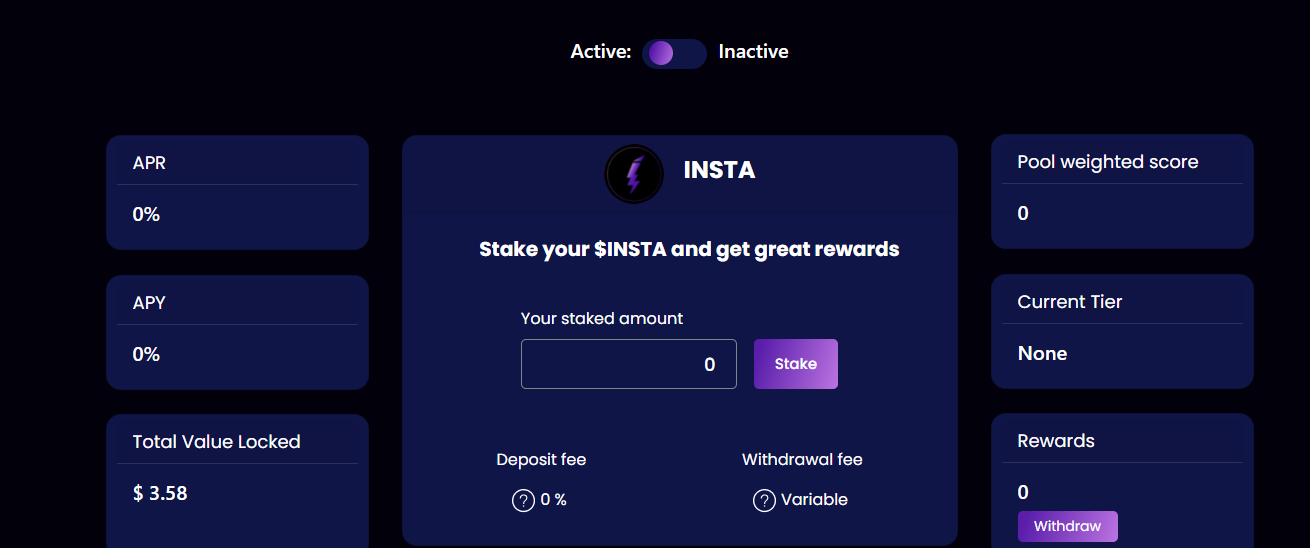 * $INSTA의 형태로 지불된 언스테이킹 수수료는 소각되어 $INSTA 토큰의 디플레이션에 기여합니다.