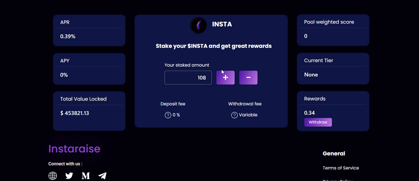 우리는 첫 IDO 및 CEX 상장 이전 커뮤니티 여러분을 위한 새 스테이킹 베네핏을 출시하게 되어 매우 기쁩니다. 우리는 커뮤니티 피드백을 토대로 열심히 일할 것이며 계속해서 Instaraise를 발전시켜 나갈 것입니다.