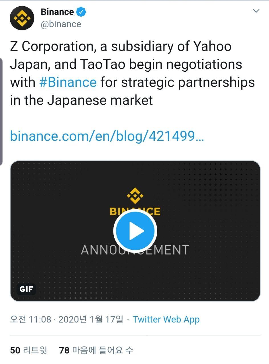 - 바이낸스는 일본 진출을 위해, Z코퍼레이션, 타오타오와 전략적 파트너쉽 협상을 진행중입니다.