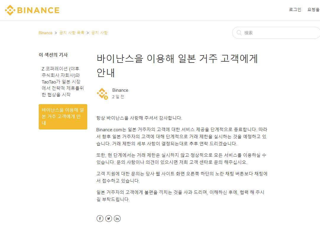 - 이와는 별개로, 바이낸스는 최근, 일본 거주고객에 대한 서비스 제공을 단계적으로 종료한다고 공지를 하였습니다.
