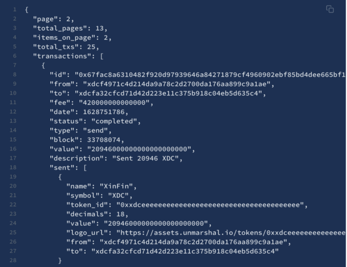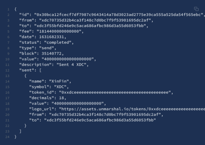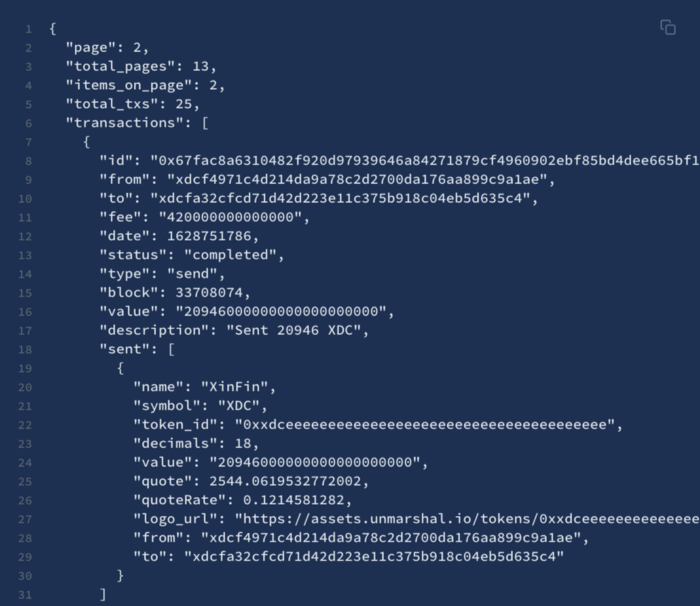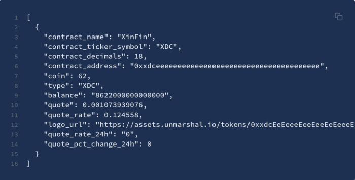 토큰 잔액 API는 주어진 지갑 어드레스에 대한 XDC 체인 위 모든 자산을 다룹니다. 사용자는 본인의 지갑에 있는 모든 자산에 대한 디테일을 확인할 수 있습니다.