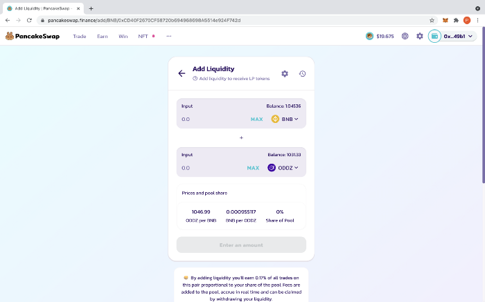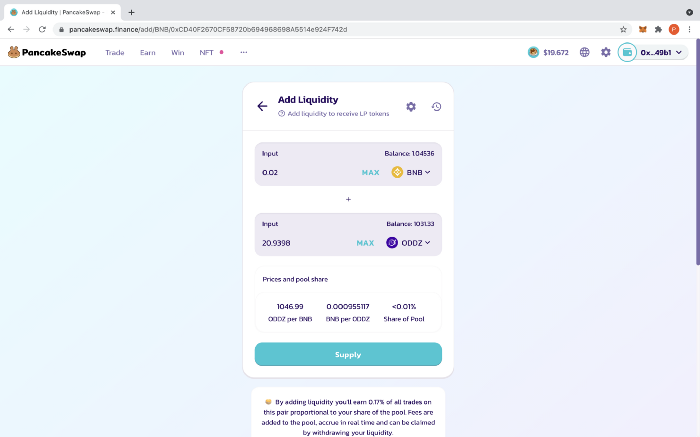 스텝 3. 이상적인 $ODDZ 토큰 금액과 이에 상응하는 $BNB 토큰을 입력한 뒤 지원 및 공급 트랜잭션을 서명합니다.