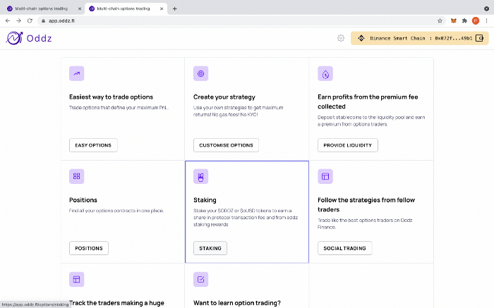 스텝 4. Oddz 플랫폼을 방문해 지갑을 연결한 뒤 스테이킹을 선택합니다.