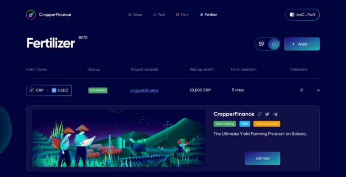 Fertilizer는 CropperFinance의 팜 런처로, 이를 통해 파머들은 프로젝트의 팜이 대중에게 공개되기 전에 커뮤니티 팜 이벤트에 참여할 수 있는 화이트리스트에 등록할 수 있습니다. Fertilizer는 CropperFinance 팀이 심사숙고해 결정한 프로젝트만을 제시합니다. Fertilizer의 배경과 혜택에 대해 더 자세히 알아보기 위해 당사의 Fertilizer 미디엄 게시글을 확인해 주세요.