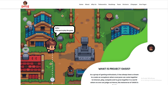 스텝 1 - projectoasis.io에 접속합니다. ‘Hello! Click me to play the game’ 대화창을 클릭합니다.