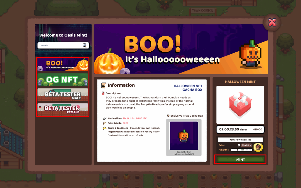 스텝 7 - 당첨된 이벤트 배너를 클릭하면 디테일을 확인할 수 있습니다. 이번 민팅 세션에서 모든 NFT는 무료기 때문에 가격이 0 OASIS입니다. ‘민트’를 클릭합니다.