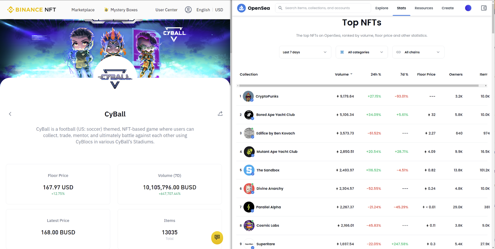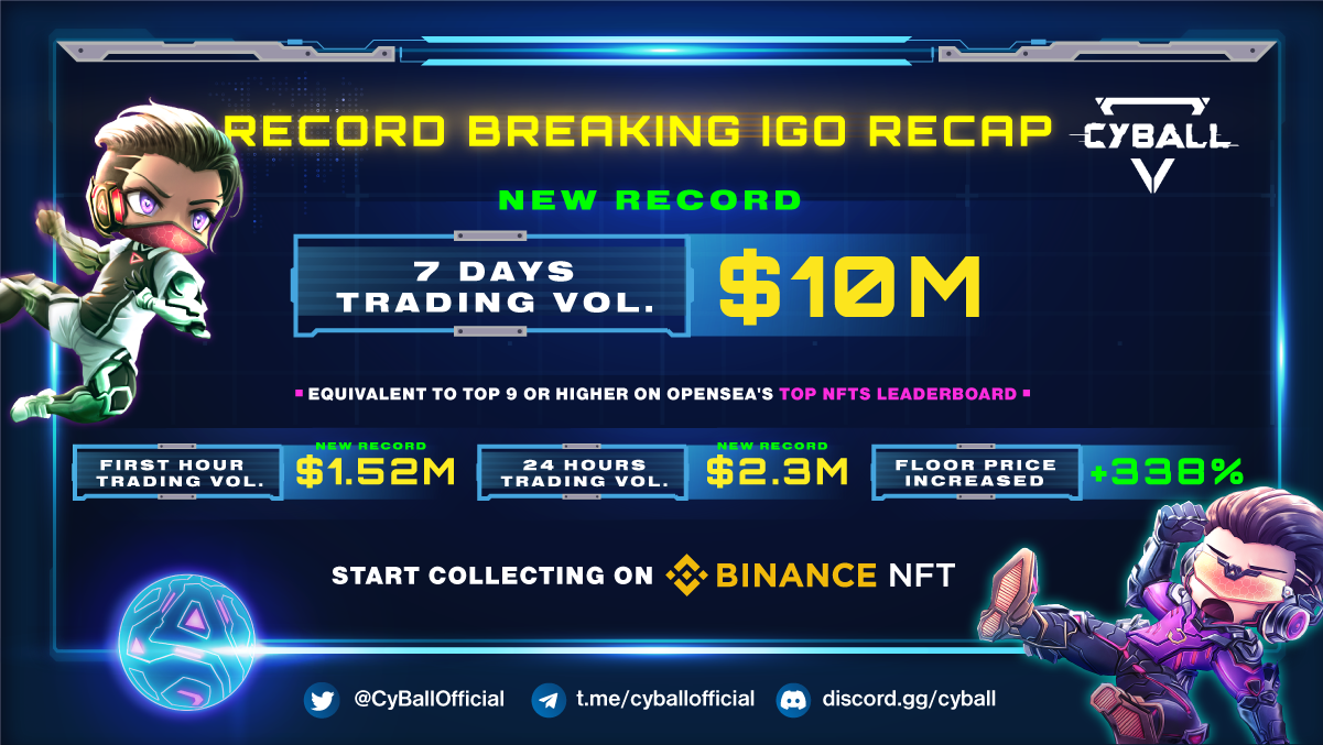 11월 4일 출시한 CyBall의 Genesis Packs IGO는 모든 플랫폼에 걸쳐 놀라운 판매량을 기록하며 출시 1분 내에 완파되었고, 바이낸스 NFT에서는 판매 개시 한시간 안에 $1.52m 및 7일 안에 ~$10m을 달성했습니다. 참고로, 이 거래량 수치는 CyBall을 OpenSea 톱 NFT 리더보드 9위에 올려놨을 것입니다. 나아가, 3 타입의 팩 최저가격이 모두 최초(저점) 가격보다 338% 혹은 그 이상 상승했습니다. 이 모든 성과는 현재까지 바이낸스 NFT 플랫폼에서 그 어떤 프로젝트도 달성하지 못한 것이며, 12월 게임 출시시 많은 호응이 있을 것으로 예상하고 CyBall 커뮤니티 멤버들과 파트너들은 매우 기대하고 있습니다.