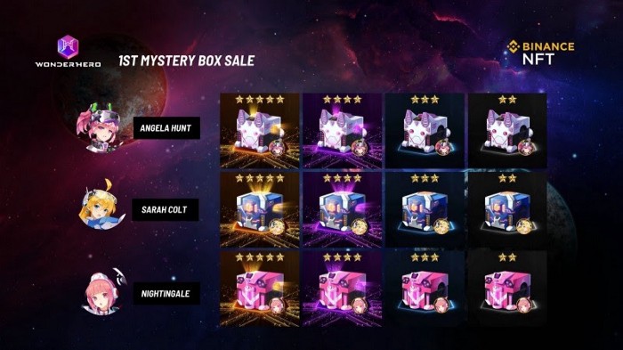 미스터리 박스는 공식 판매가 시작된 후 1시간 후에 바이낸스 NFT 마켓플레이스에서 거래할 수 있지만, WonderBox에서 NFT를 얻으려면 공식 WonderHero 웹사이트에서만 열 수 있습니다.