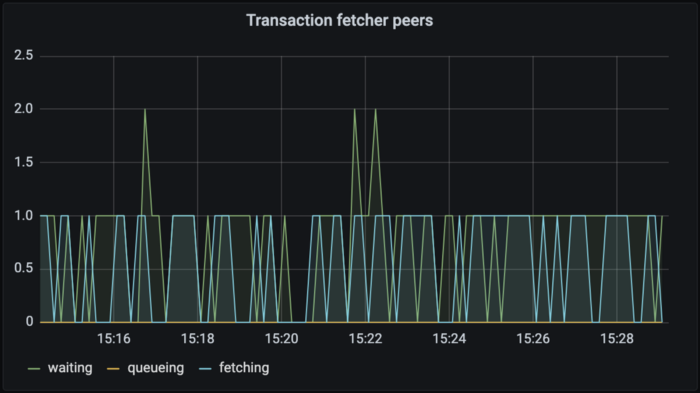 fetcher/transaction/fetching/peers는 상호작용하는 피어의 수를 계산하고, 나머지 피어는 대기열 상태로 처리됩니다.