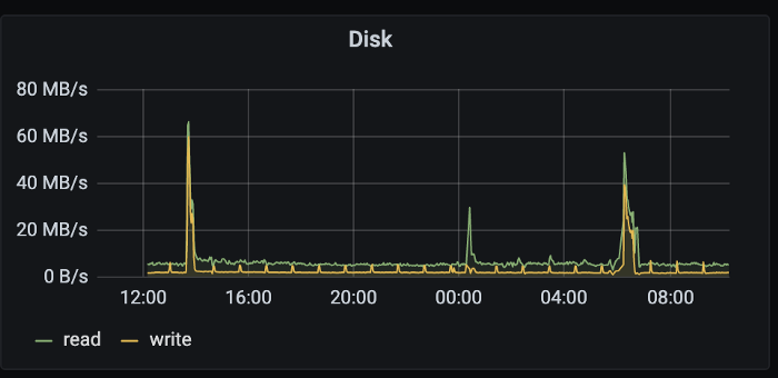 우리는 이 데이터를 사용해 인프라에 결함이 있는 경우 디버깅할 수 있습니다. 디스크의 읽기 및 작성 데이터 속도는 노드에서 RPC 또는 웹소켓 클라이언트로 더욱 많은 오래된 데이터가 전송될 때 스파이크되며, 주기적 짧은 스파이크는 스테이트 작성 및 메모리 플러시 이벤트이기 때문에 걱정할 것이 아닙니다. eth/db/chaindata/disksize는 메인 DB와 옛 DB를 포함하는 체인데이터 DB의 점유율을 나타냅니다.