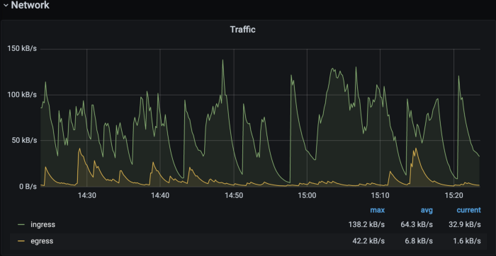 eth/egress.meter 메트릭은 geth 디스커버리 포트에서 측정되는 전체 송신 노드 트래픽을 나타냅니다. 이상적으로, 노드가 싱크 해제되면 피어로부터 상태와 트랜잭션을 가져오기 때문에 트래픽이 더 높습니다. 일반적 동기화는 트래픽이 비교적 일정하지만 블록 사이즈가 평균보다 높을 때 스파이크가 일어날 수 있습니다.