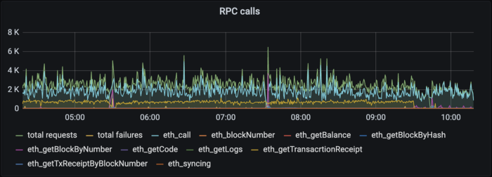 RPC 모듈은 성공 및 실패와 함께 RPC콜의 수를 추적하기 위해 카운터를 제공합니다. 특정 eth 방법에 대한 개별 카운트 또한 응답 기간과 함께 추적됩니다. RPC 콜 카운터의 파생물은 리소스 사용량, fetcher 상태, 그리고 피어 트래픽과 함께 더 나은 척도가 되어 퍼포먼스와 관련된 문제를 디버깅합니다.