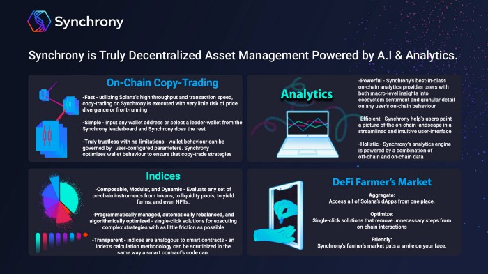 Synchrony는 정교한 분석과 머신 러닝 알고리즘을 활용해 온체인 기구 세트를 평가하고 최적화해 생태계 기본 요소들의 다방면적 노출을 위한 원클릭 솔루션을 만들어내는 최첨단 분산형 자산 관리 플랫폼입니다. 이 플랫폼이 구동하는 핵심적인 기능으로는 카피 트레이딩과 구성성 있는 인덱스가 있으며, 둘 모두 이용하기 쉬운 DeFi 파머스 마켓으로 촉진됩니다 - 하나의 로케이션에서 전체 솔라나 블록체인과 상호작용할 수 있는 공간. 어렵게 들릴 수 있지만, Synchrony는 A.I를 활용해 DeFi를 단순화시킵니다.