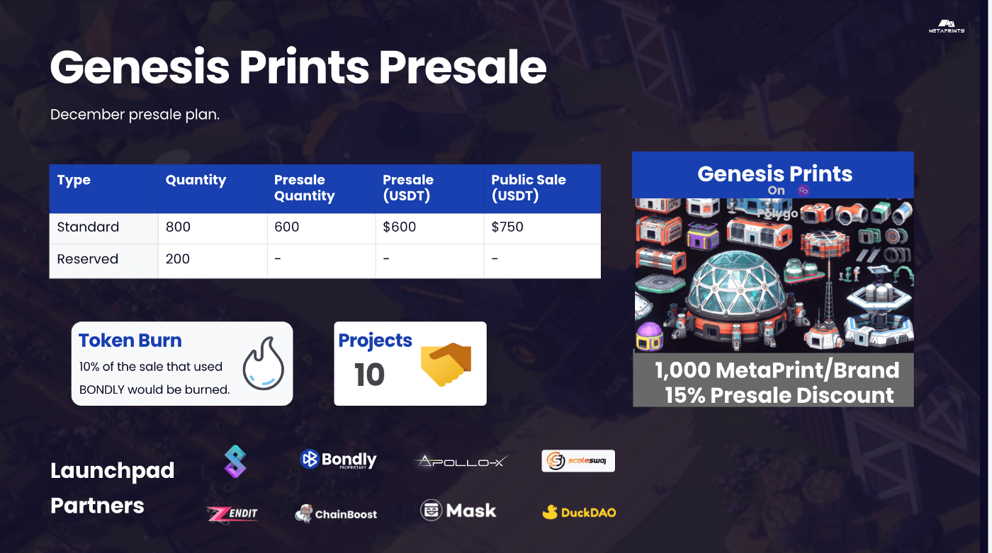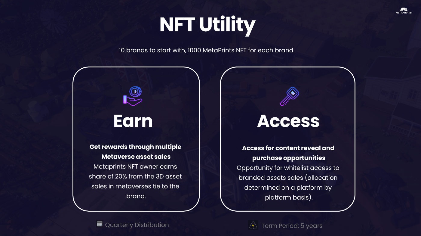 Metaprint NFT는 브랜딩된 자산의 청사진으로, 메타버스 플랫폼들이 요구하는 3D 자산을 최고의 애니메이션 전문가들이 만들 수 있도록 촉진하도록 판매됩니다. 크리에이터와 브랜드 또한 생성된 자산이 창출하는 수입 중 일부를 나눠 갖게 되며, 이렇게 함으로 이 모델을 통해 체인 내 모든 사람들이 혜택을 받게 됩니다.