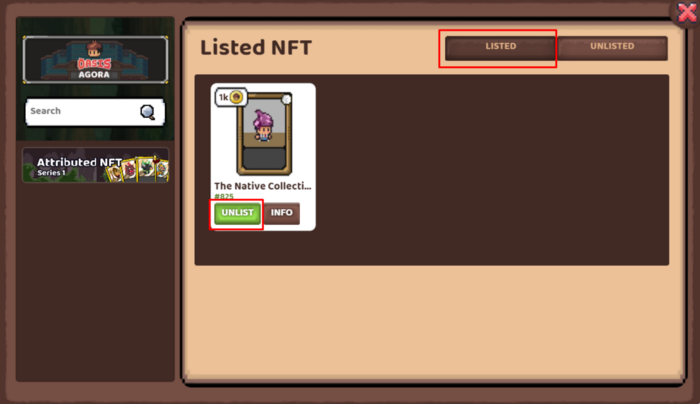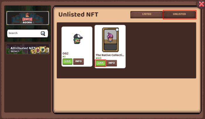 스텝 7 - NFT를 상장 또는 비상장하려는 경우, ‘View NFT’를 클릭해 현재 상장 및 비상장된 NFT를 확인합니다. Attributed NFT 시리즈 1 배너를 클릭해 시장에 등록된 Attributed NFT 시리즈 1 목록을 확인합니다.