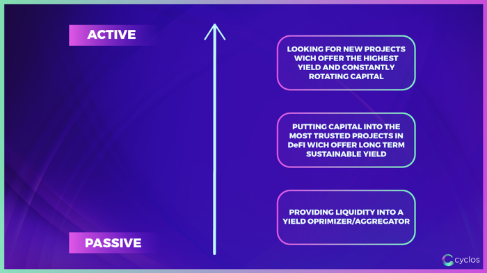 이자 파밍 또한 시작할 때 여러 DeFi 프로토콜에 대해 배워야 하는 단계가 필수적이라는 점에서 비슷합니다. 이자 파밍은 여러분의 선택에 따라 수동적 또는 능동적일 수 있습니다. 가장 수동적인 방법은 파밍 전략을 제안하거나 자동적으로 실행하는 이자 집계기를 이용하는 것입니다. 반대로, 여러분은 직접 활발하게 프로젝트를 리서치하고 이들의 이자를 비교하며 더 높은 이자를 제공하는 새로운 프로젝트를 탐구할 수 있기도 하며, 여기에는 더욱 많은 실사가 필요하고 리스크 또한 큽니다. 투자하는 만큼 돌아옵니다. DeFi는 매우 빠르게 변하기 때문에, 이자를 최대화하려면 계속해서 자본을 회전시켜야 합니다.