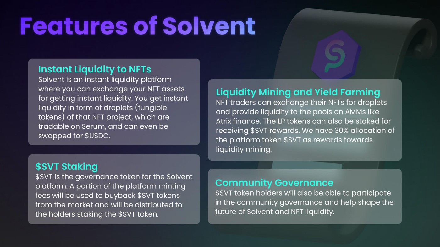 Solvent는 NFT를 대체 가능한 토큰으로 변환하여 사용자에게 즉각적인 유동성을 제공하는 플랫폼입니다. NFT의 즉각적인 유동성은 사용자에게 오늘날보다 빠르게 NFT를 거래할 수 있는 플랫폼을 제공할 수 있습니다. Droplets은 솔라나의 AMM 및 Serum 오더북에서 거래할 수 있습니다. 사용자는 자신이 소유한 Droplets을 교환하여 솔벤트 버킷의 NFT를 교환하거나 플랫폼에서 직접 Droplets을 $USDC로 교환할 수 있습니다. 그들은 또한 Droplets의 유동성을 유동성 풀에 걸고 유동성 보상을 받을 수 있습니다. 대출, 대출, NFT 파생 상품 및 더 흥미로운 통합과 같은 기능이 곧 출시될 예정입니다.