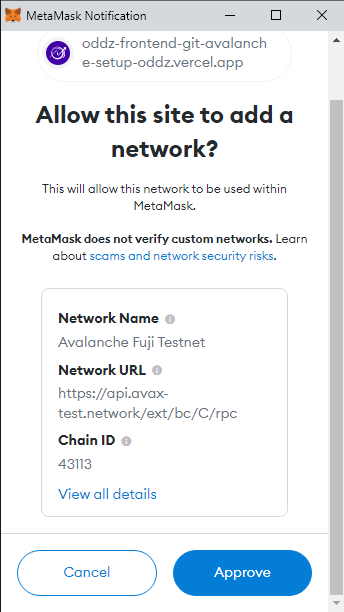 스텝 5: MetaMask 지갑에 Avax 테스트넷을 추가하라는 메시지가 표시됩니다. ‘승인’을 클릭하면 완료됩니다!