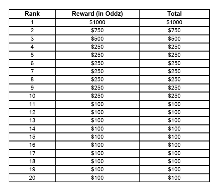 탑 20명의 우승자 사이의 ODDZ 토큰 분배는 다음과 같습니다