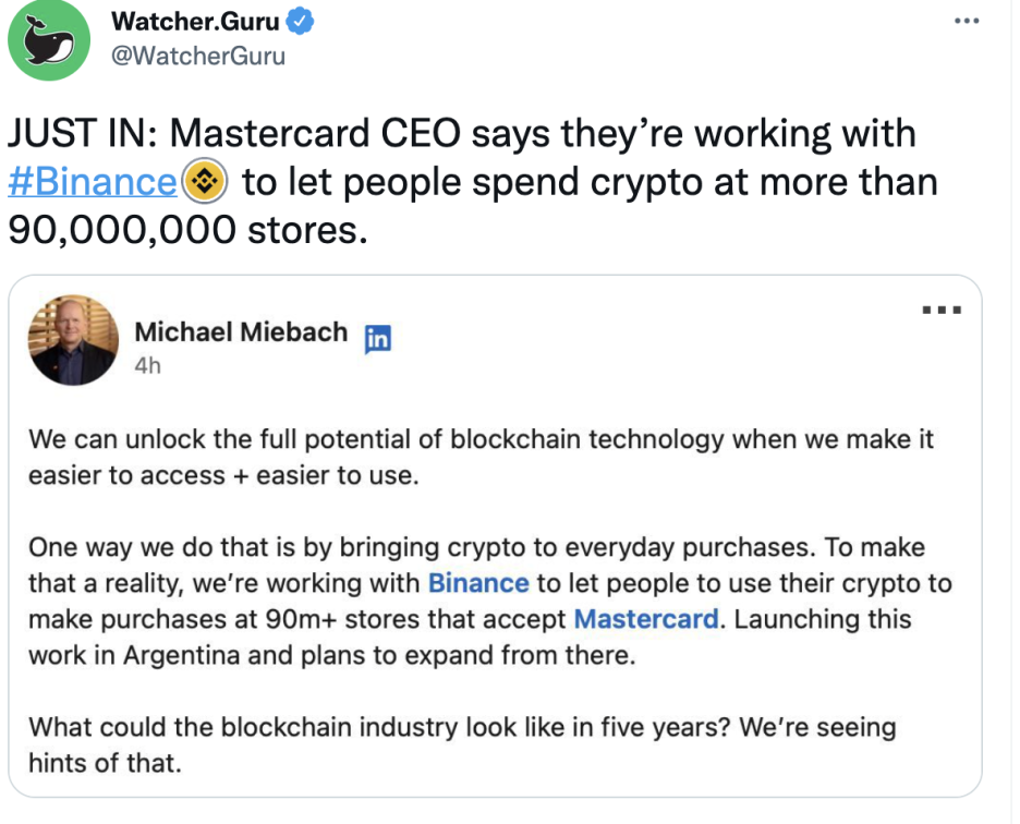 WatcherGuru의 공식 트위터에 따르면 마스터카드 CEO가 링크드인 포스트에서 "일상용품 결제에 암호화폐를 도입하기 위해 바이낸스와 협력 중"이라며 "이를 통해 9000만개 이상 마스터카드 가맹점에서 암호화폐 결제를 이용할 수 있도록 할 것"이라고 밝혔다고 전했습니다.