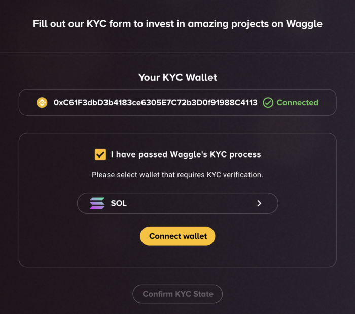 다른 지갑 (BSC, SOL, ETH)으로 이미 KYC를 진행한 경우에만 ‘I passed KYC on Waggle before’를 체크합니다. 여길 체크하면 이미 KYC를 완료한 지갑을 연결해 소유권을 확인하도록 안내받게 됩니다.