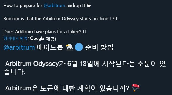 18일 오전 Arbitrum 공식 트위터에 'Odyssey가 6월 22일 오전 3시 (KST)에 시작한다'는 공식 공지가 올라왔습니다. 따라서 관련 이벤트에 대한 자세한 내용을 알아보며, Arbitrum 자체 생태계에 대한 정보들을 짧고 간단하게 알아보겠습니다.