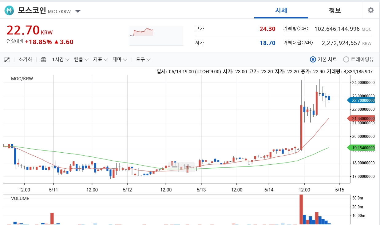 11시 40분에 게재된 공지였지만 이미 모스코인은 11시부터 상승을 시작하여 선반영 된 모습이다. 이미 코인 투자자들 사이에서는 모스코인이 입출금이 중지될 것을 알았기 때문에 미리 선반영이 된 것이 아니냐는 의견이 많았다.