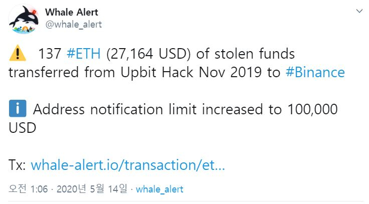 웨일얼럿에 따르면 업비트에서 도난된 137개의 이더리움이 바이낸스로 이동되었고, 이 소식을 접한 창펑 자오 바이낸스 CEO는 해당 암호화폐를 모두 동결했으며, 업비트와 협력해 법적절차를 검토한 후 자금을 인도할 것이라고 밝혔다.