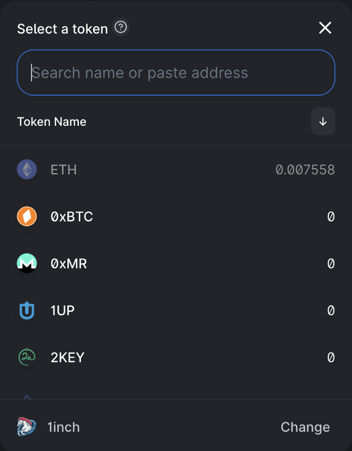 - 위의 그림에서 USDT 오른쪽에 있는 화살표를 클릭하면 “Select a token” 화면이 다음과 같이 표시됩니다.
