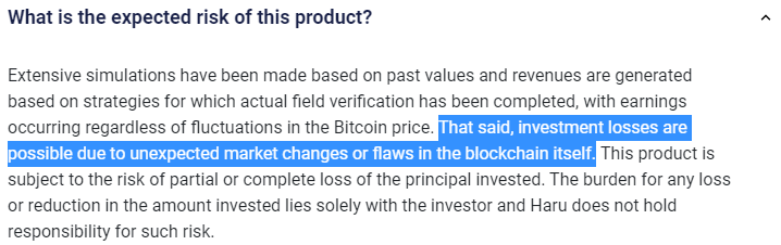 해당 상품은 Haru Earn, Haru Earn Plus과는 다르게 하이리턴을 위한 하이리스크 상품으로 투자금 손실이 발생할 수 있다는 경고를 해주고 있으니 상품간의 장점과 단점을 모두 꼼꼼히 따져서 본인에게 맞는 상품을 투자하는 것을 추천드립니다.