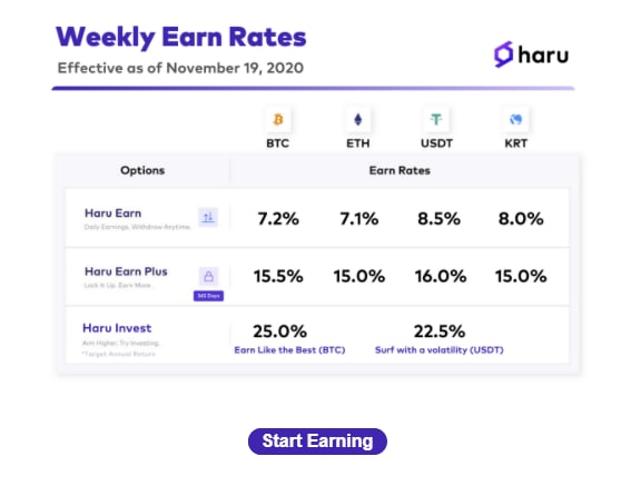 Haru Earn은 투자자의 자산을 락업(Lock-up)하지 않고 단기 거래 전략을 기반으로 발생하는 수익을 매일 이자로 지급하는 상품으로 비트코인, 이더리움, 테더, 테라 KRT 총 4가지의 예금을 지원합니다.