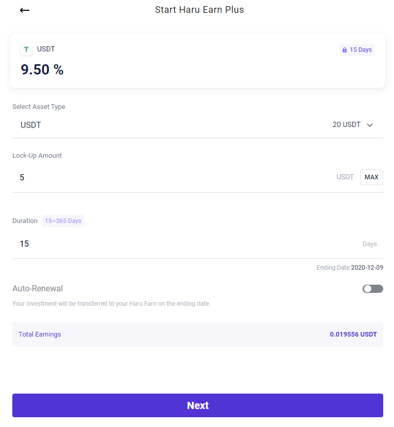 Haru Earn Plus의 수익률은 락업 기간과 투자하는 코인, 시장 거래량 및 가격 변동성에 따라 변경됩니다.