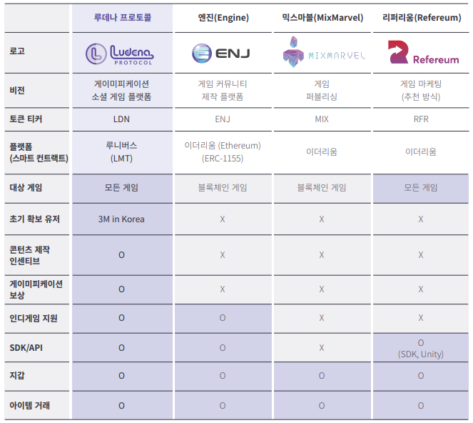 타 프로젝트와 루데나 프로토콜과의 비교표이니 참고하시면 좋을 것 같습니다.