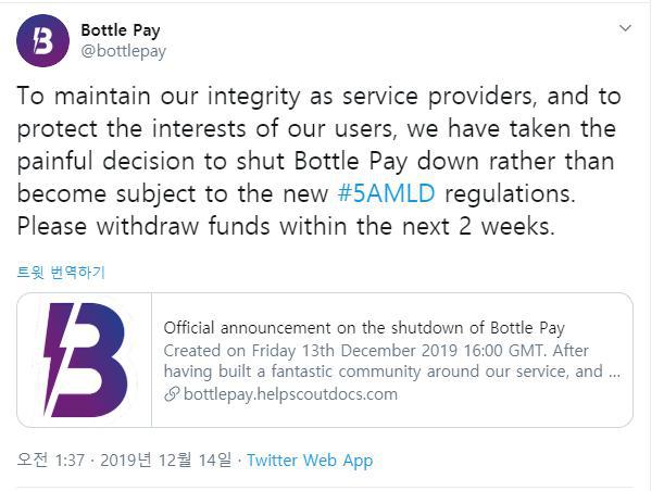 5. EU 자금세탁법으로 인해, Bottle Pay 운영 중단
