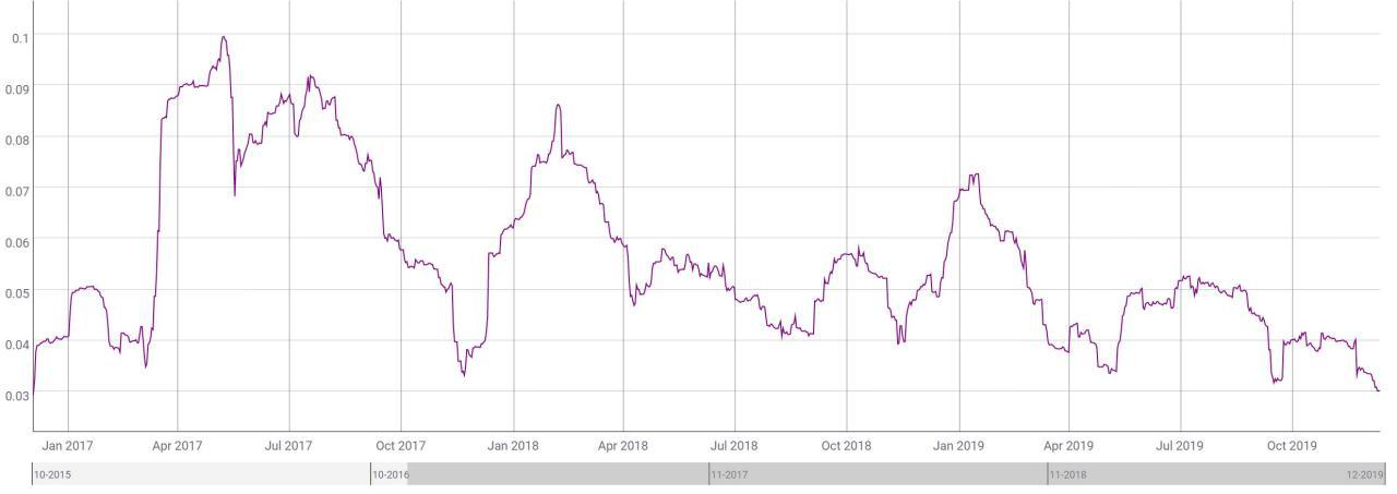- 이더리움 60일 변동성 수치 2016년 최저치로 떨어졌습니다. (동시에 다년간 최저치에 도달)